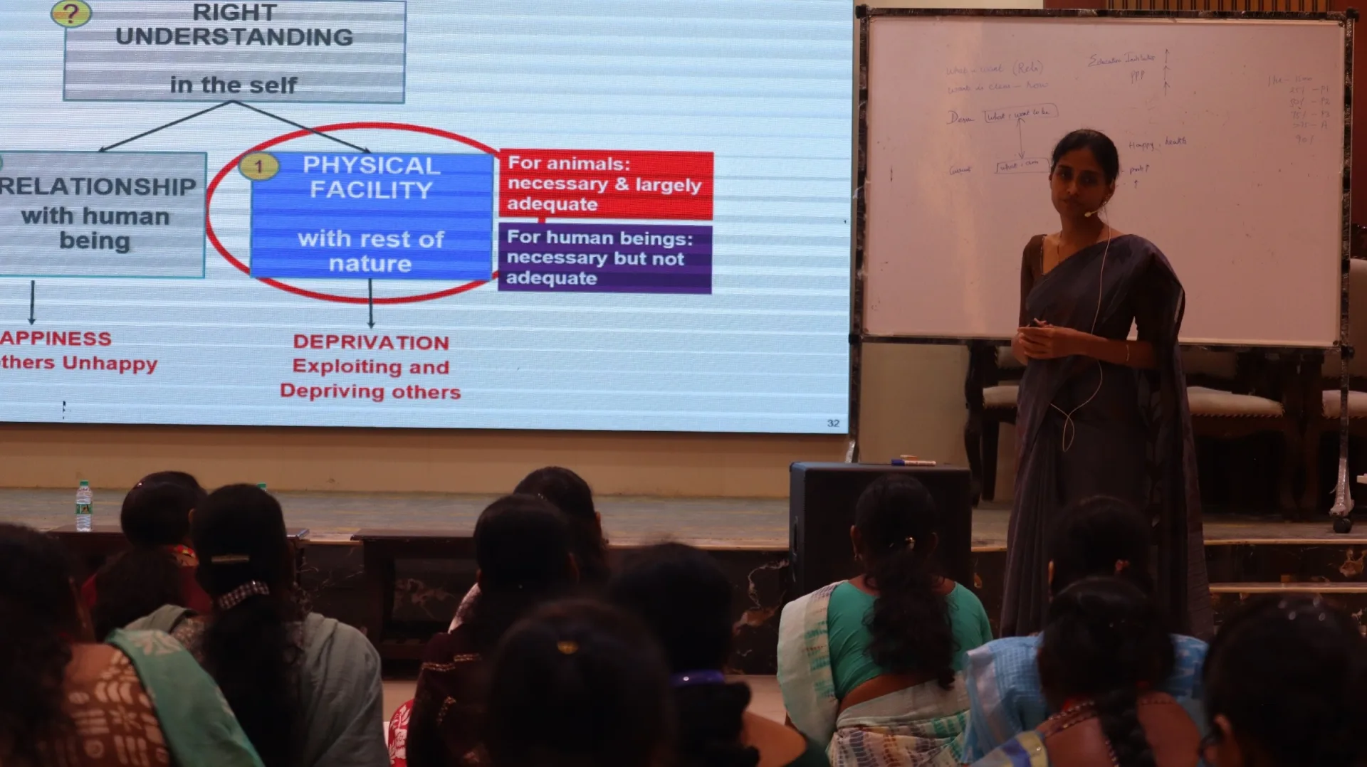 Focused on foundational concepts of values, right understanding, and holistic living. Participants explored harmony within the self, relationships, and nature. Sessions emphasized self-verification, distinction between needs and wants, and sustainable happiness over temporary excitement.