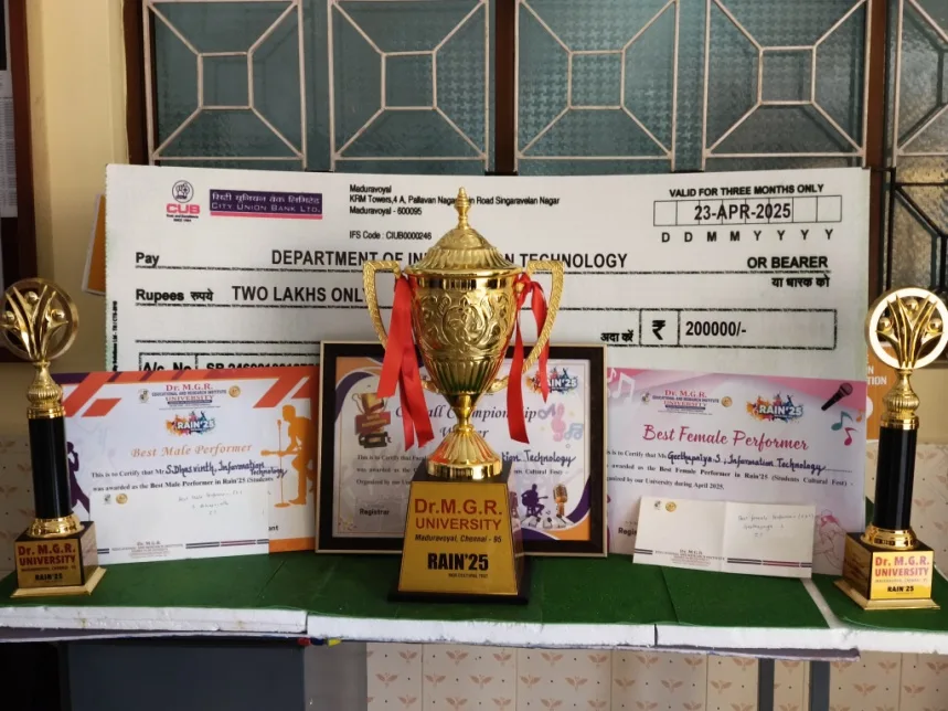 Dr. MGR–ACS Space Tech Centre of Dr. M.G.R. Educational and Research Institute, Dr. MGR–ACS CanSat Team successfully participated in the Grand Finale of the CanSat India Student Competition 2024–25, organized by IN-SPACe and ISRO at Tumkuhirai, Kushinagar, Uttar Pradesh, from October 26–30, 2025. Mr. Pranava Kumar I, IV Yr from Department of Information Technology was part of the team.