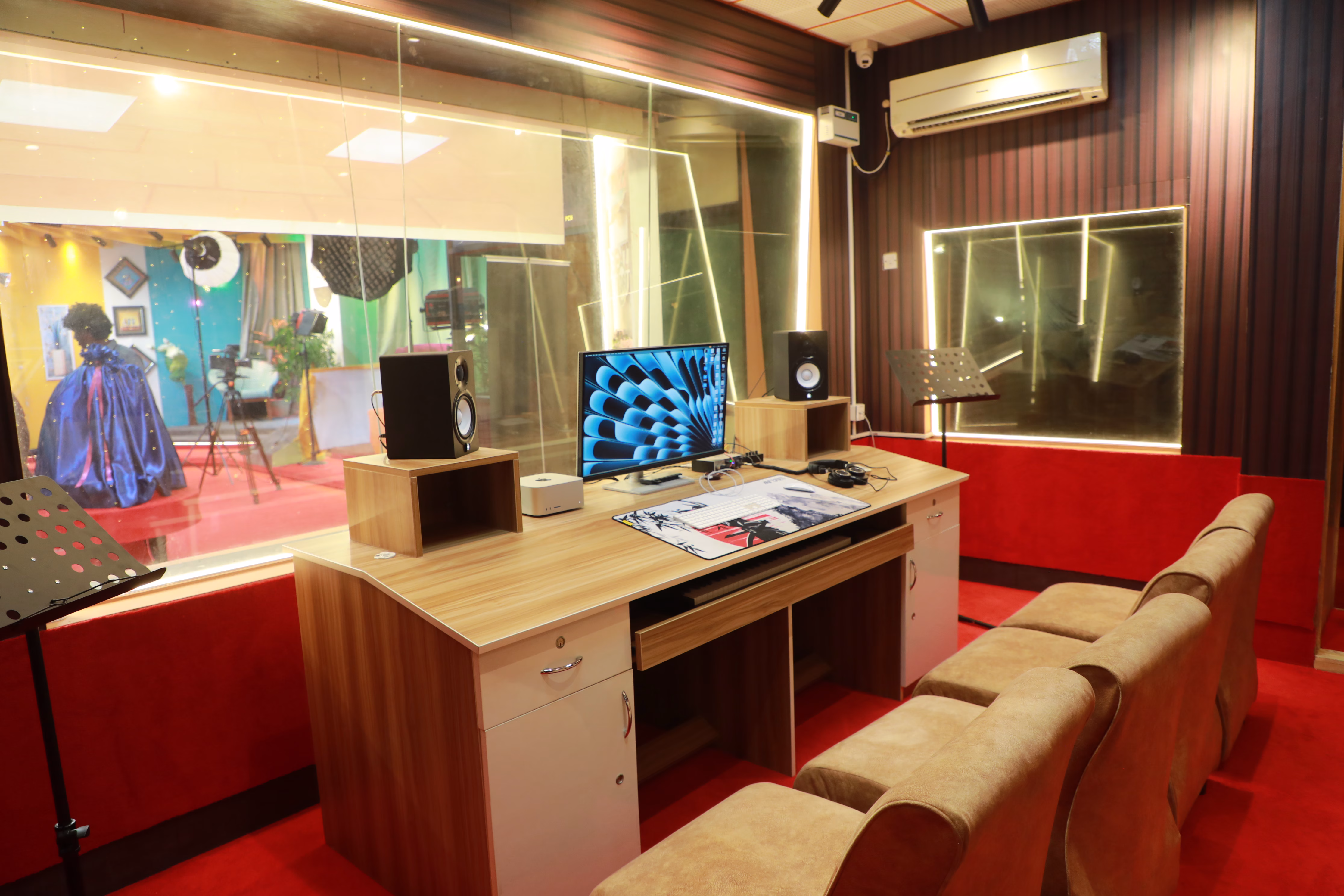 - It consists of a ‘Live Room’ attached with isolated ‘booth’ equipped with Mics, and 12 Channel Audio Mixer, controlled by the Sound Engineer with Pro Tools software in the control room.