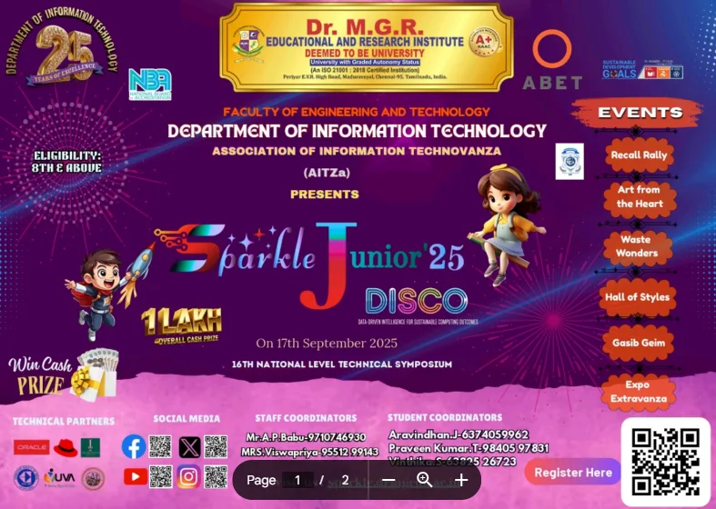 SPARKLE 25 commenced with a grand inaugural ceremony on the 16th of September at 10:30 AM.. The first day featured a dynamic mix of technical and non-technical events exclusively for college students. These events tested a wide spectrum of skills from logical thinking and coding to creativity and entertainment. On the second day, on 17th September we have Mr. Daniel Jacob, Executive Vice president – HR, EC Group International, Chennai and happy to have our alumnus, Mr. Mukesh. G (2015-2019 batch), Director and Co-Founder, ELLO Grapes Technology Pvt Ltd. The second day was specially curated for school students, showcasing their talent through a variety of engaging and thought-provoking events.. Over 250 students participated in the senior events on Day 1. Nearly 250 students from various schools enthusiastically took part in the events on Day 2. The resounding success of SPARKLE 25 is a testament to the dedication, leadership, organizational skills, and teamwork displayed by both our students and faculty. SPARKLE 25 was a vibrant confluence of innovation, collaboration, and creativity. We extend our heartfelt thanks to every individual who contributed to making this event a grand success.