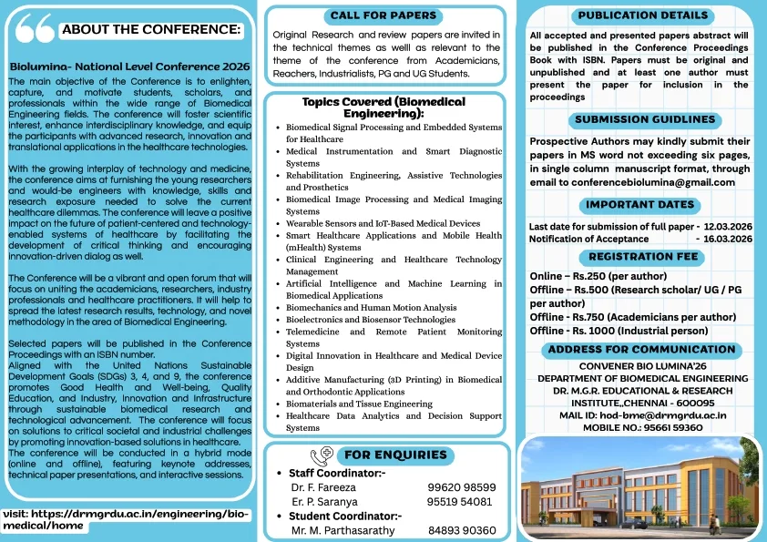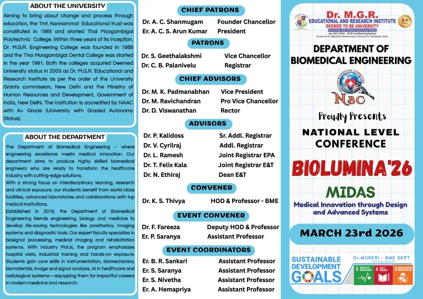 The BIOLUMINA 2026 is a National Level Conference organized by Department of Biomedical Engineering, Dr. M. G. R. Educational and Research Institute, University is an attempt to focus on Technical events related to Biomedical Engineering and its application. The Conference provides the platform to develop students research skills.