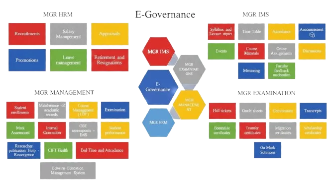 - E-governance is implemented with the help of several digital platforms such as Online Admission Eduwize, - EMS, OPAC, and MGR IMS, G SUITE, IN house programs, eSSL eTime TrackLite Server, CiftHealth ET (Hospital Management System), BackBone, medical records and central lab, MGR IMS, G SUITE, CELL, MGR ORANGE, MGR OFFICIALS, COMPATRIOT, Researgence, e-Sanad, docswallet, etc.