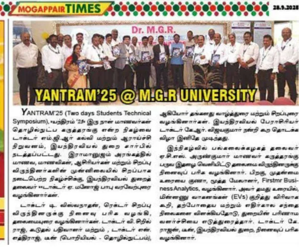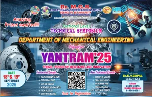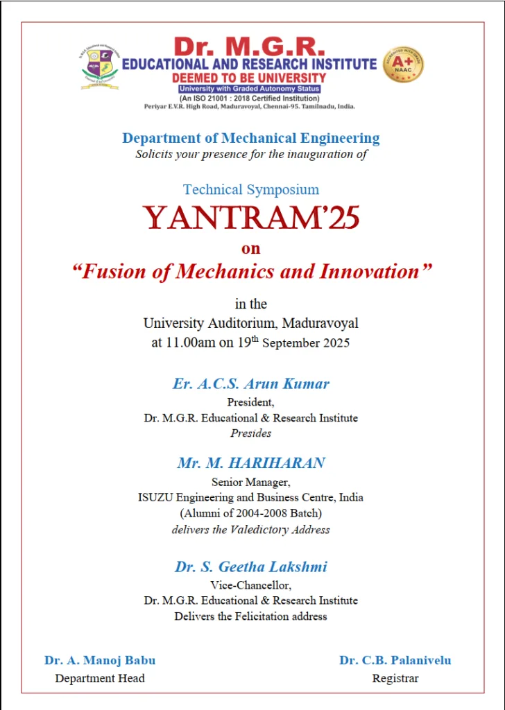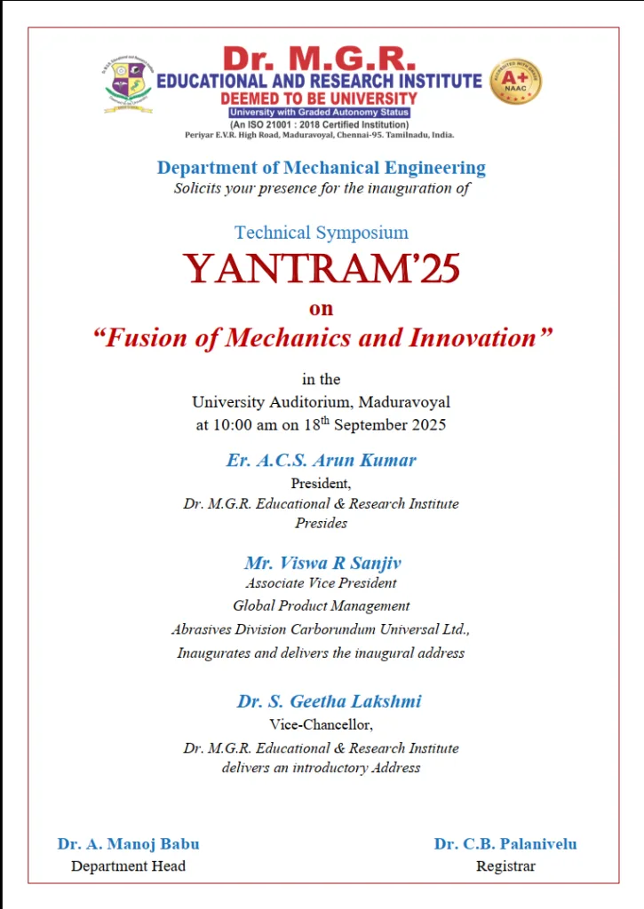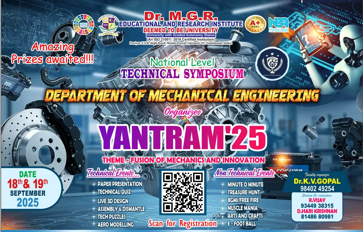 YANTRAM’25 – A Student Technical Symposium , organized by the Department of Mechanical Engineering, Dr. M.G.R. Educational and Research Institute , on 18th and 19th September 2025 This symposium will feature technical sessions, exciting competitions, and excellent networking opportunities.