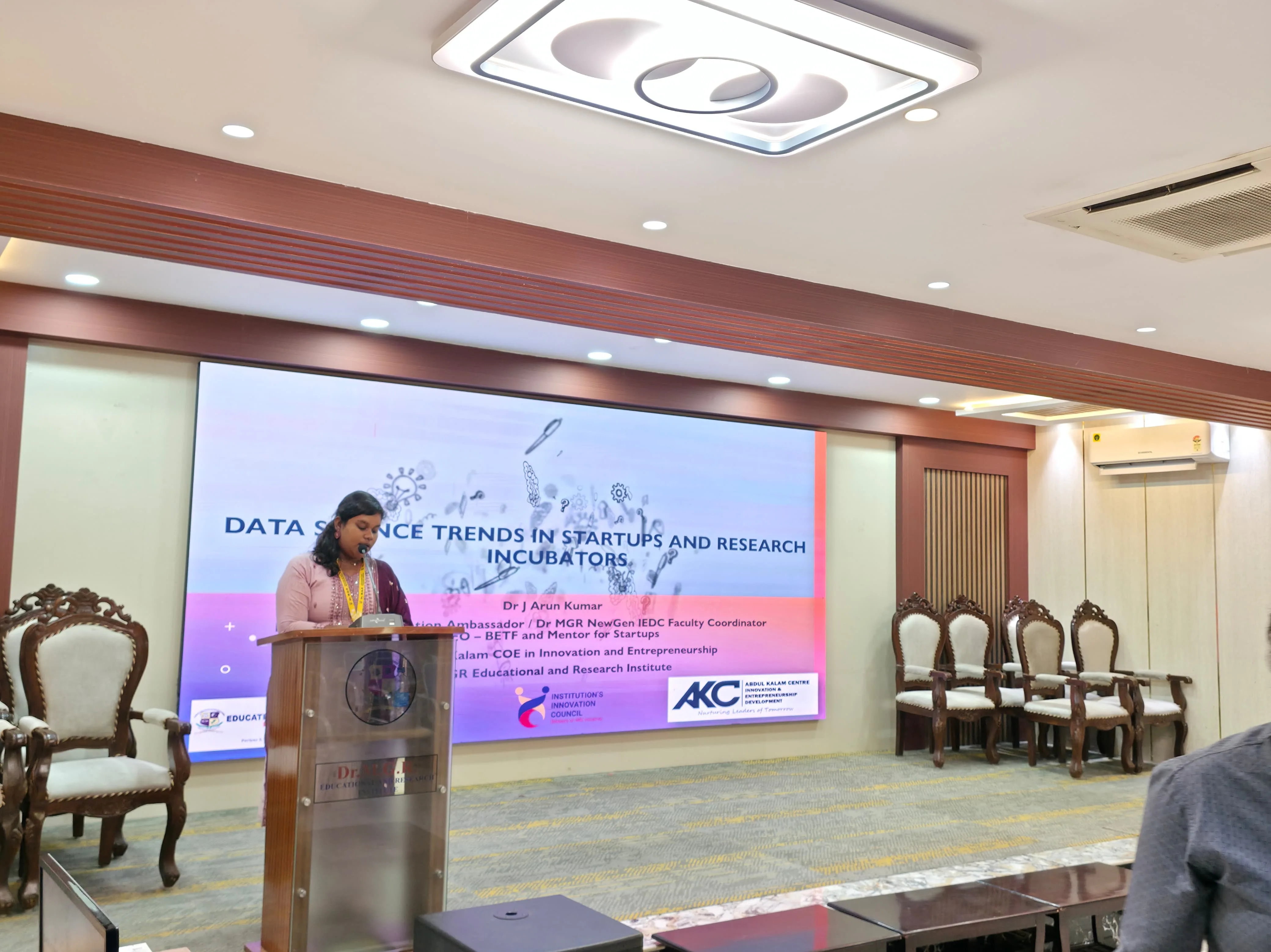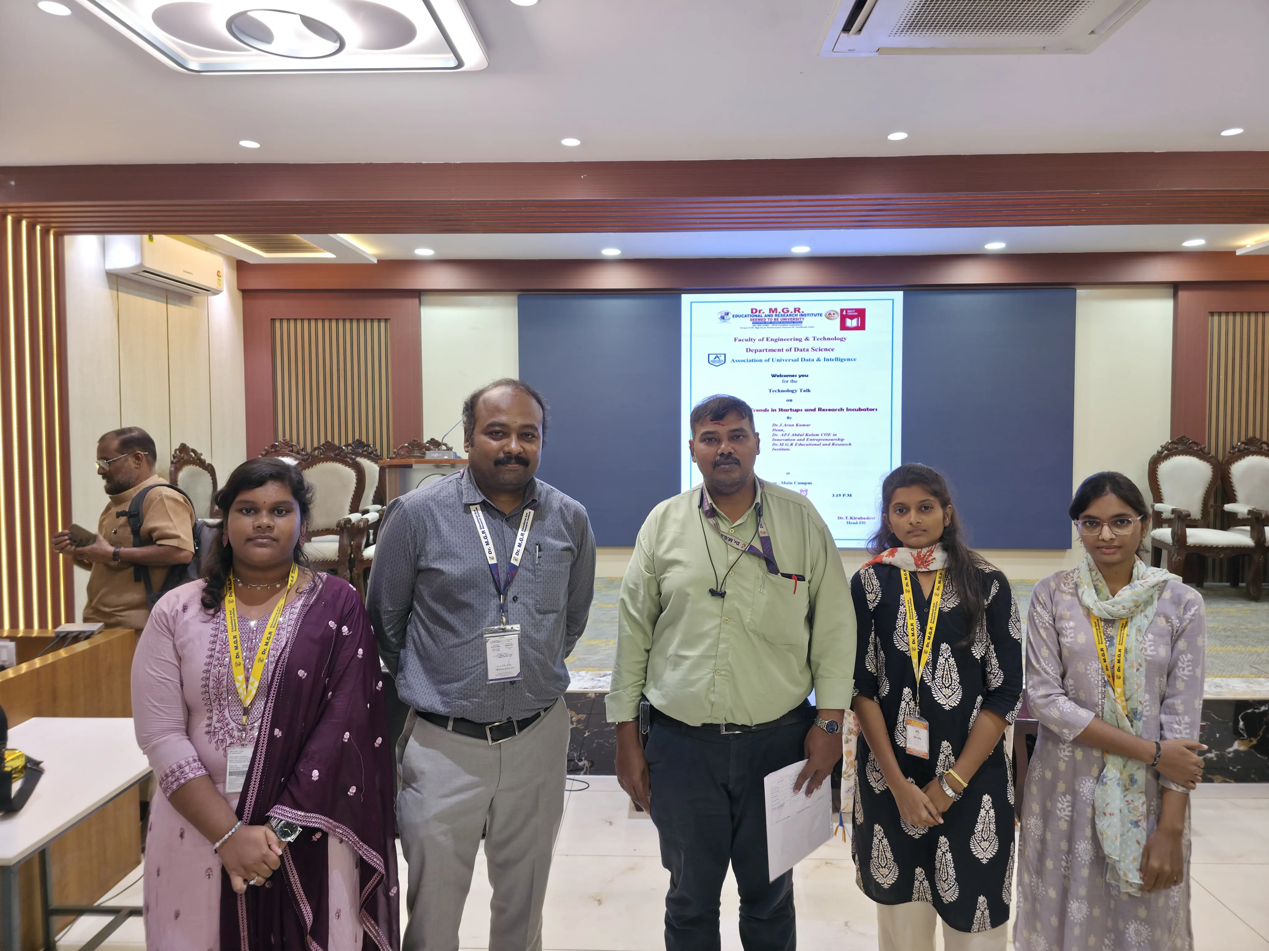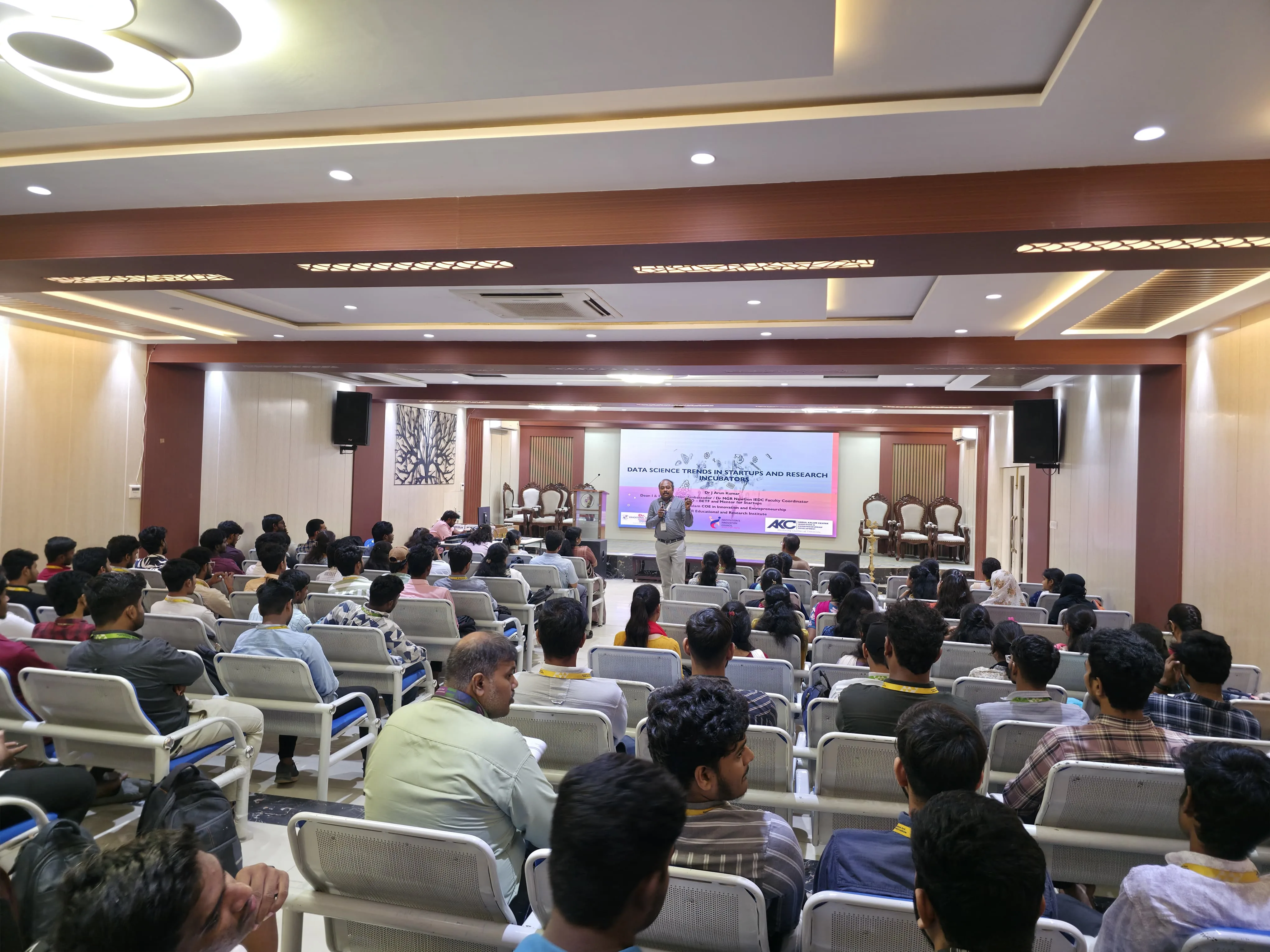 The Department of Data Science at Dr. M.G.R Educational and Research Institute organized a Technology Talk on Data Science Trends in Startups and Research Incubators on 20 November 2025 at RA Auditorium, in collaboration with AUDI. The event aimed to expose students to evolving data science applications in entrepreneurial and research ecosystems, bridging academic learning with industry practices. Dr. J. Arun Kumar, Dean of Dr. APJ Abdul Kalam Centre of Excellence in Innovation Entrepreneurship, delivered insights on AI, machine learning, automation trends, incubator opportunities, essential skills for data scientists, and startup success models. Key activities included an interactive lecture and Q&A session addressing startup challenges, funding, and research collaborations. Over 120 students participated, gaining practical knowledge to align skills with innovation pathways. The session concluded with felicitation of the speaker by Dr. T. Kirubadevi, Head of the Department of Data Science, enhancing students’ perspectives on interdisciplinary problem-solving.